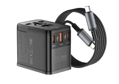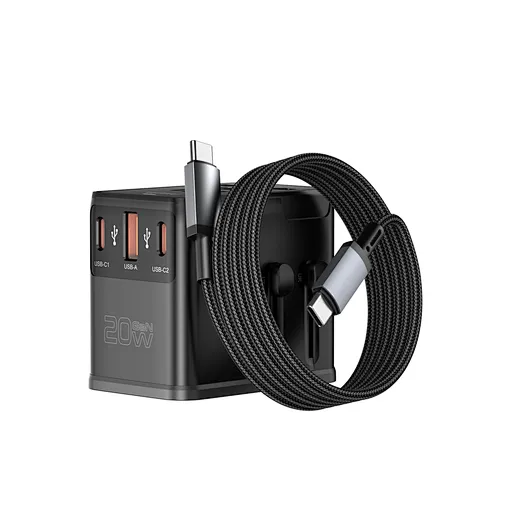 1. Ultra-compact dual-AC Gallium Nitride (GaN) global charger with a built-in cable; universal for worldwide use, provides fast charging for multiple devices.