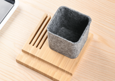Pen box holder with card holders and phone stand Recycled Felt+Bamboo-RCS material. Product Size: 13.9x13x9.5cm. Packaging: Kraft Paper Box