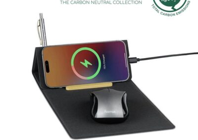 Memorii® Folding Wireless Mousepad & Desk Organizer is an elegant and compact desk accessory made from RCS-certified recycled PU. It includes a 15W wireless charger and phone stand with a bamboo stopper, mousepad and pen stand. Folds flat and can be easily carried on the go. Blace is a CHANGE ZERO product, which means that it is developed with a net zero carbon footprint – By using RCS-certified recycled PU materials, we reduce 14% carbon emissions from material use (verified by ecoact®). Further, we offset the balance 1.08 kgCO2eq per unit by financing renewal energy projects through Climate Partner, making it a carbon-zero product. Packed in an elegant gift box.