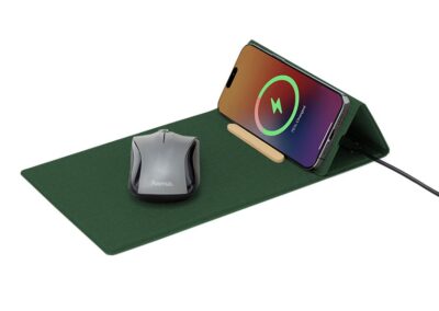Memorii® Folding Wireless Mousepad & Desk Organizer is an elegant and compact desk accessory made from RCS-certified recycled PU. It includes a 15W wireless charger and phone stand with a bamboo stopper, mousepad and pen stand. Folds flat and can be easily carried on the go. Blace is a CHANGE ZERO product, which means that it is developed with a net zero carbon footprint – By using RCS-certified recycled PU materials, we reduce 14% carbon emissions from material use (verified by ecoact®). Further, we offset the balance 1.08 kgCO2eq per unit by financing renewal energy projects through Climate Partner, making it a carbon-zero product. Packed in an elegant gift box.