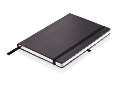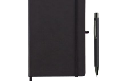Borna is a notebook and pen set consisting of a hard cover soft touch PU notebook with an anti-microbial metal ballpoint with soft rubberized finish and matt gun metal trims. The round cornered notebook consists of 160 ruled pages, 70 gsm with matching colored 3mm elastic closure, a bookmark and a pen loop. The pen has a 1200 m writing length and German Dokumental® Ink. Packed in a white gift box.