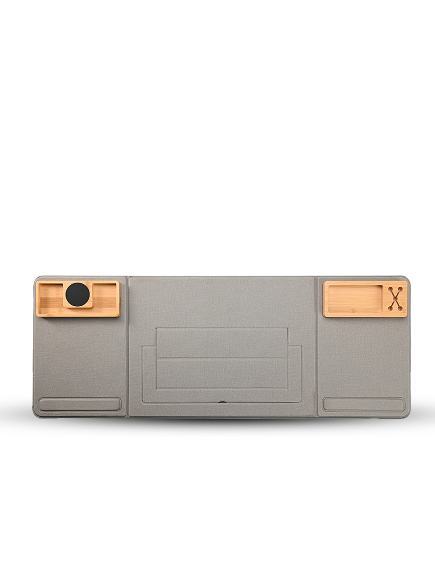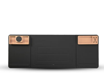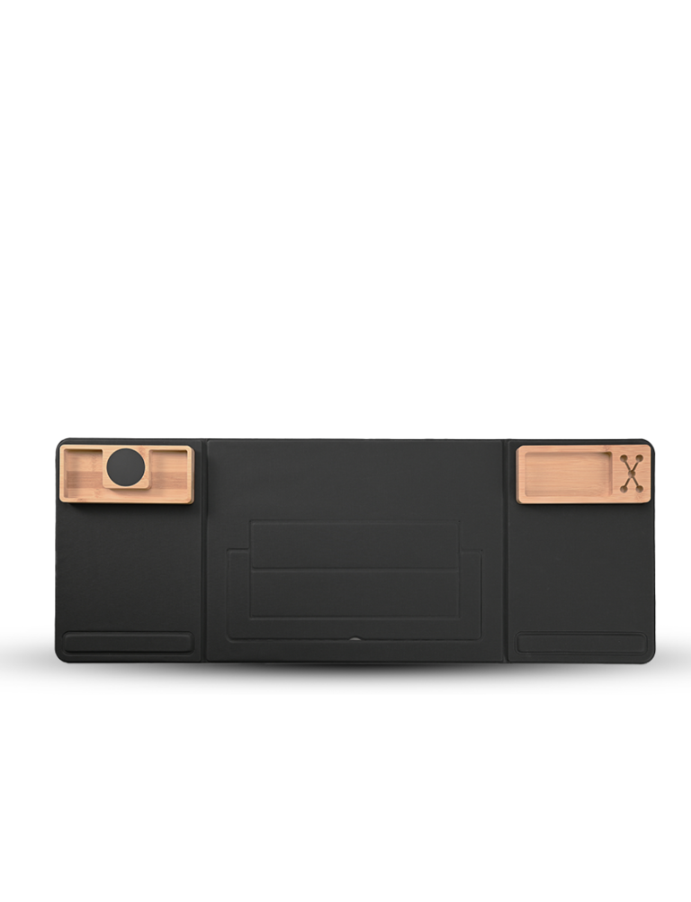Foldable Desk Pad Organizer with laptop stand and two magnet bamboo organizers. One is pen & business card holder and the other one Has 15W wireless charger and light up piece. Material has no stitching – welding technology RCS PU Material. Has a part that can be used as mousepad with armrest which is very perfect for daily desktop activity. Product Size: 80×29.8×1.8cm (open) and 40×29.8×1.8cm (folded) Packaging: FSC Paper Box