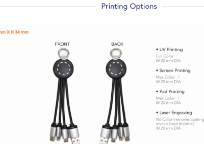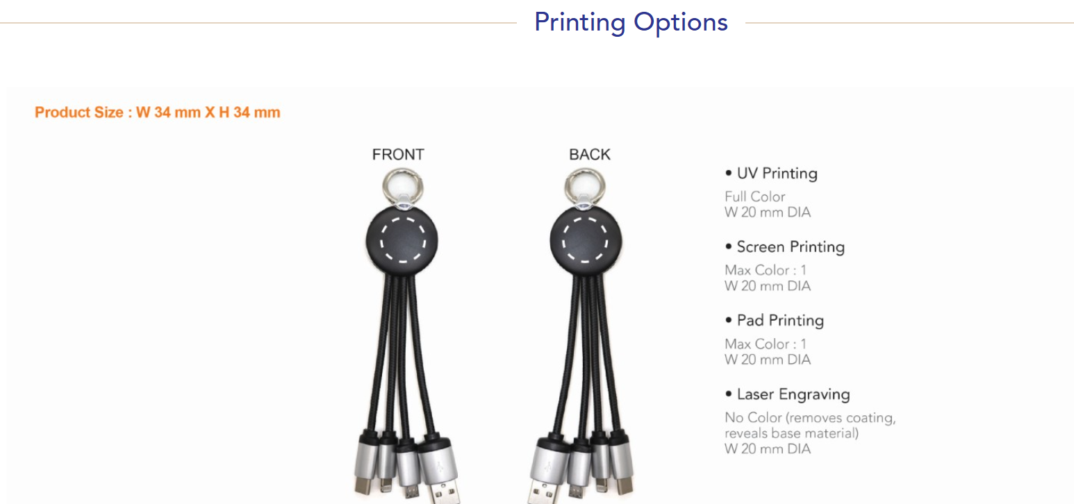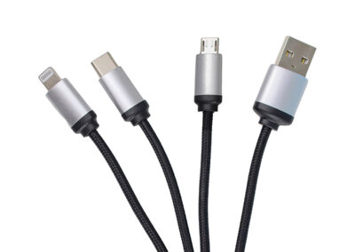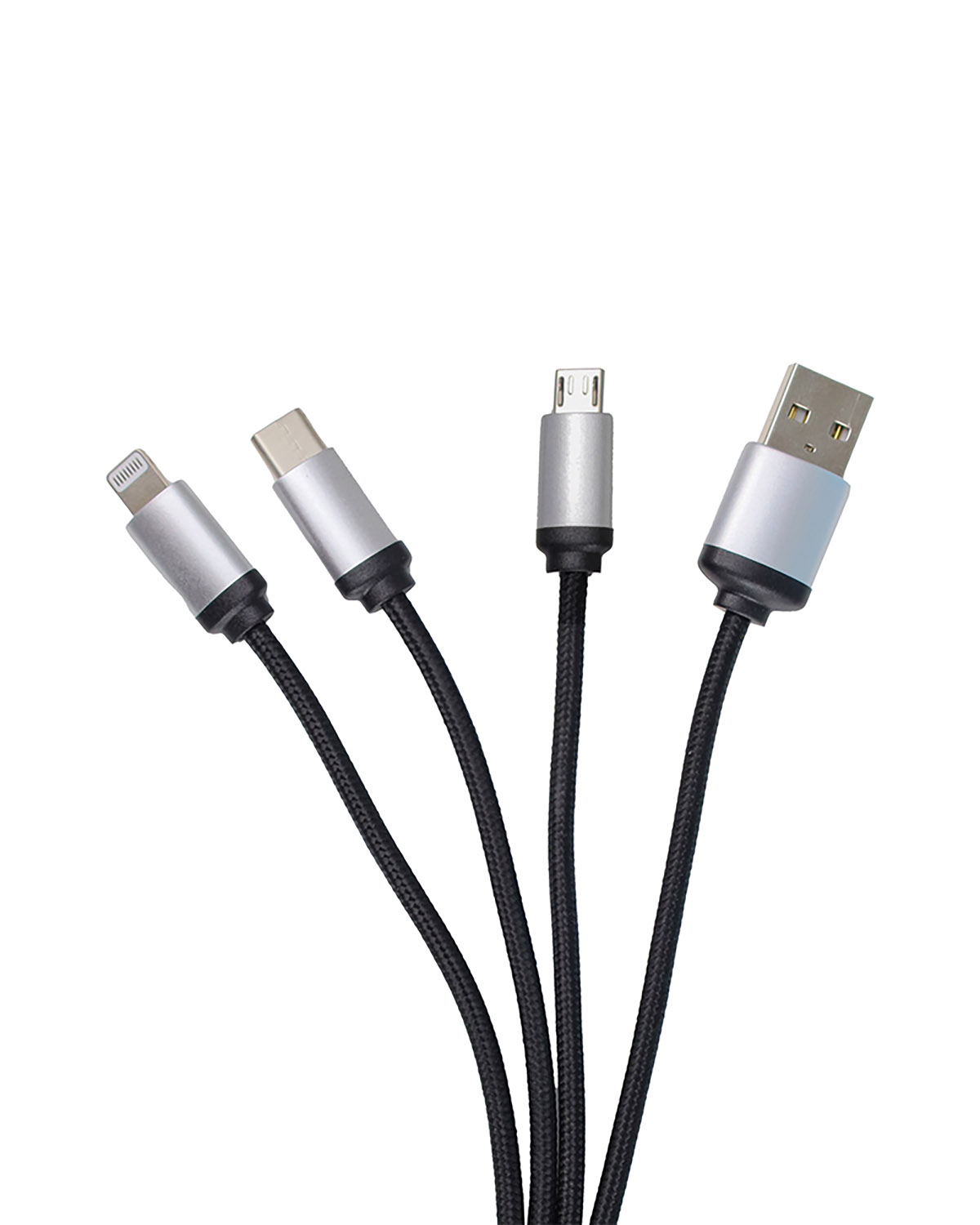 4-in-1 charging cable with iPhone, micro USB, USB, type C charging port. Comes with white led light.