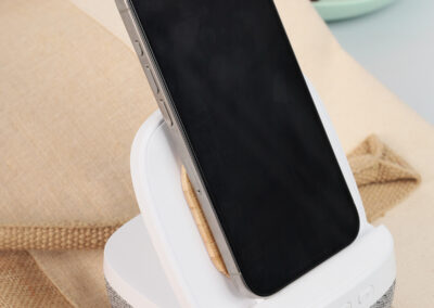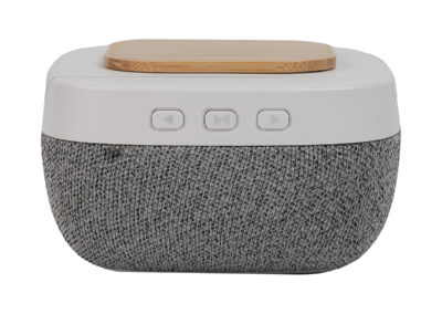 A 5W bluetooth speaker that also had an inbuilt wireless charger of 15W. The housing is made of ABS+Imitation linen+bamboo, it has a battery life of 12000 mAh and a type-C input.