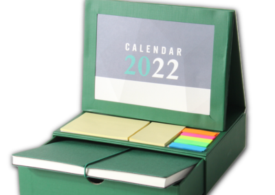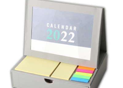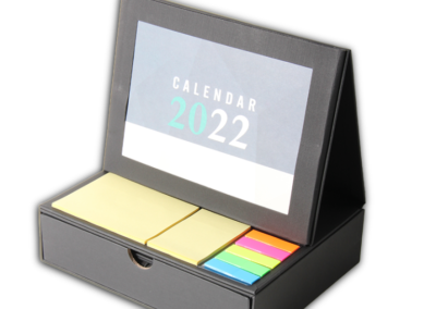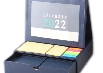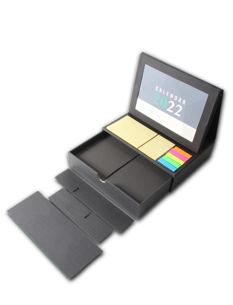 A perfect desktop gift that has a frame with 13 sheets calendar on it and a 4cm height drawer with finger hole to open from front side. Drawer comes with A5 Soft PU Lined notebook 100 sheets and 1.5cm velvet EVA foam where you can do diecut for the items that you want to add. It also includes 2 dividers that you can use as separator in the drawer turned storage. It has yellow sticky note: 10 x 7.6cm & 5 x 7.6 cm (25 sheets each pad), 5 colors PET Flag: 1.2 x 4.5 cm(25 sheets each pad). Product Size: 22.1 x 17.3 x 6.3cm; Packaging: Paper Sleeve