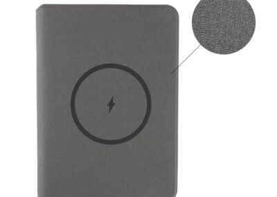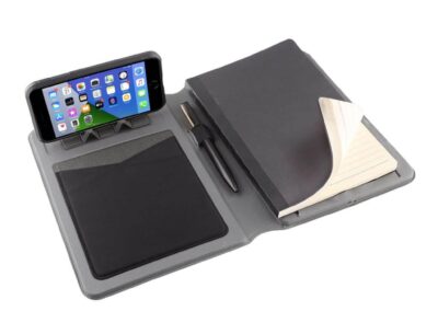 Gubin is an A5 fast charging wireless powerbank folder and organizer with a built-in 10,000 mAh powerbank and 10W wireless charger. Contains a refillable notebook with 64 sheets, a premium phone/tablet magnetic stand, pen loop and pockets for phones, credit cards, cables, etc.