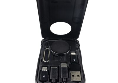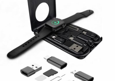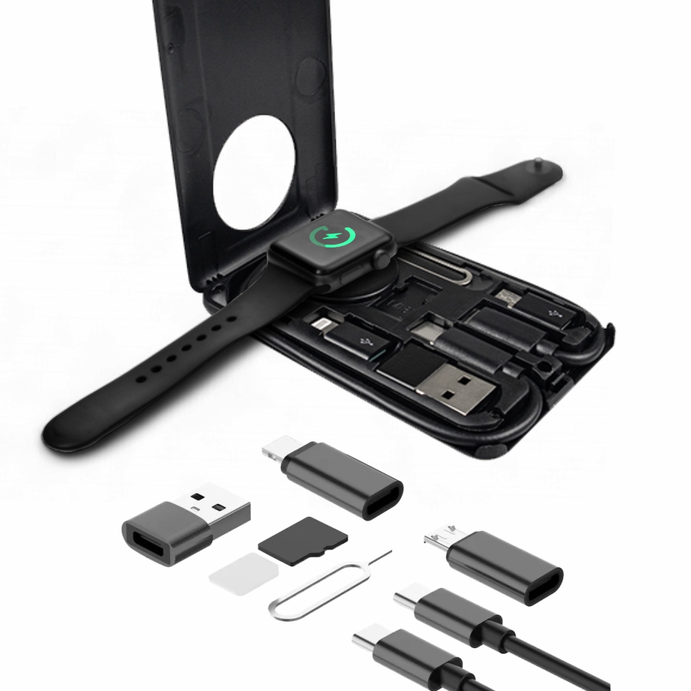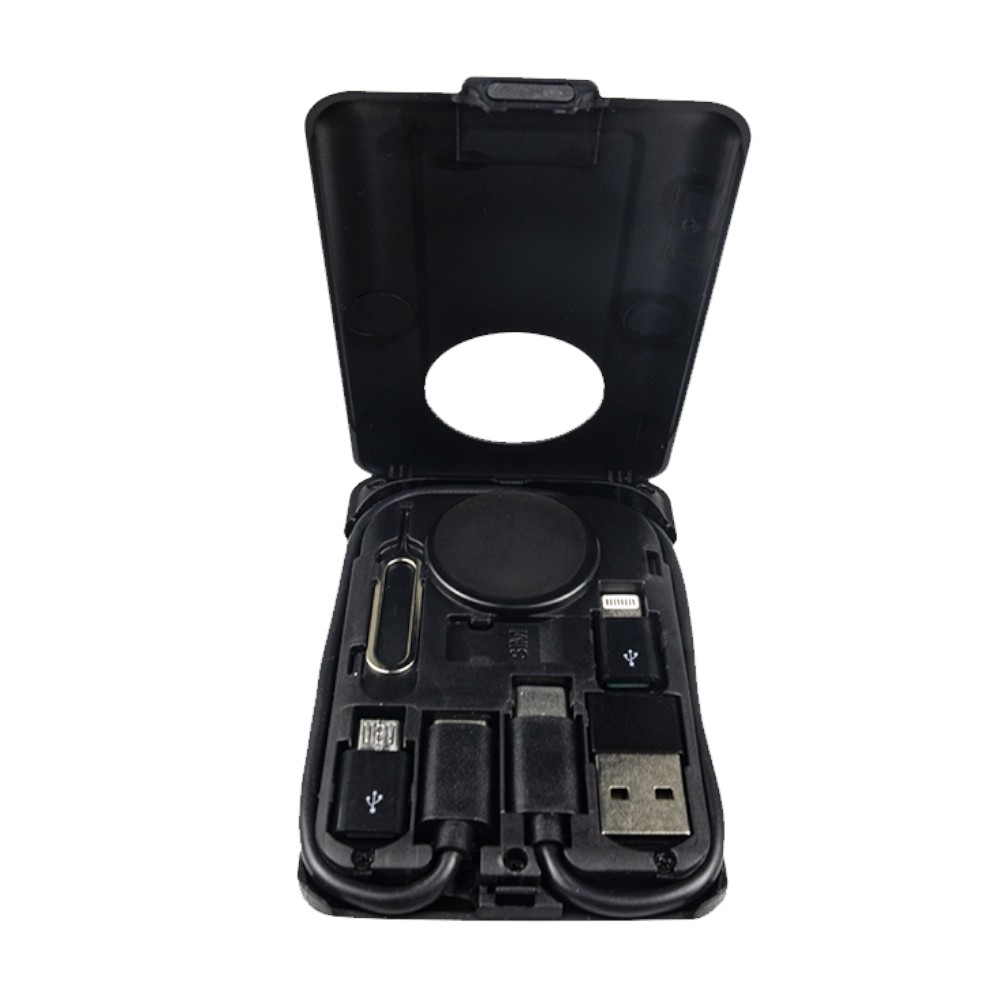 The Handy Plus is a sleek black 5-in-1 multifunctional tool kit designed for ultimate convenience. It features a phone holder, TF card slot, two SIM slots, a SIM card ejector, multi-cables, 15W wireless charging, and an Apple Watch charger. Compact and versatile, this tool kit is perfect for tech-savvy individuals.