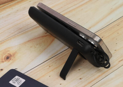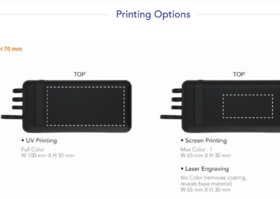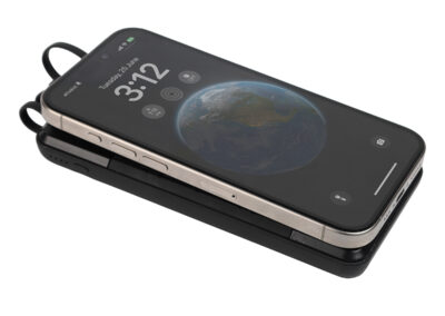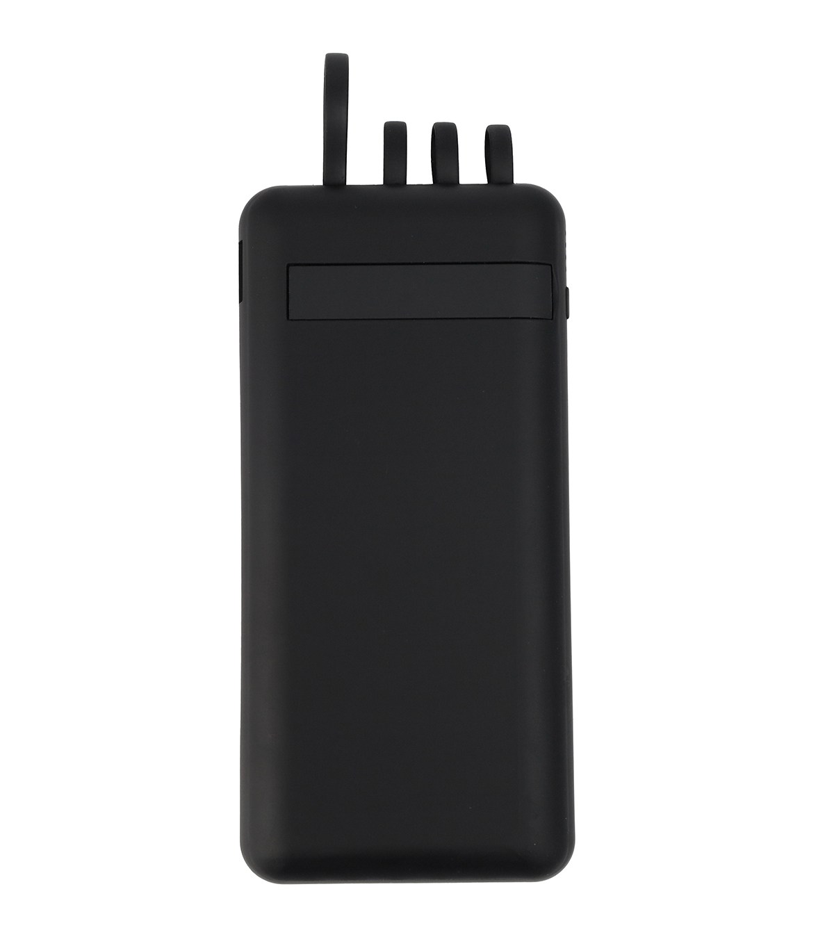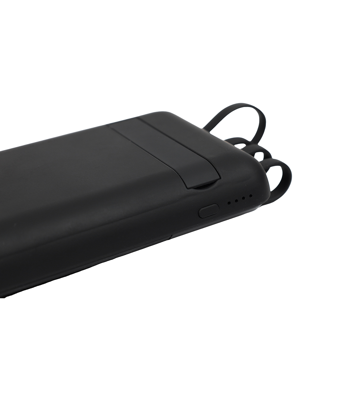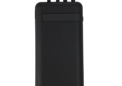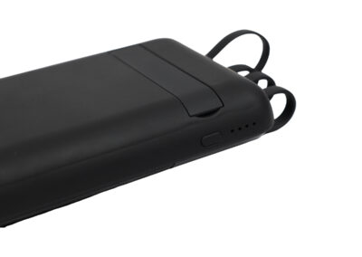 A 10000 mAh power bank with rubber body that has a wireless charging feature and a vacuum grip area. Featuring 2 USB, 1 micro, 1 Type-C output and white LED panel.