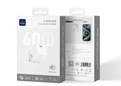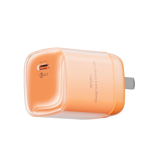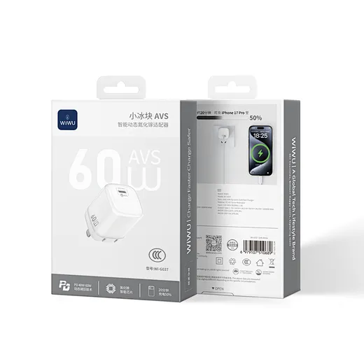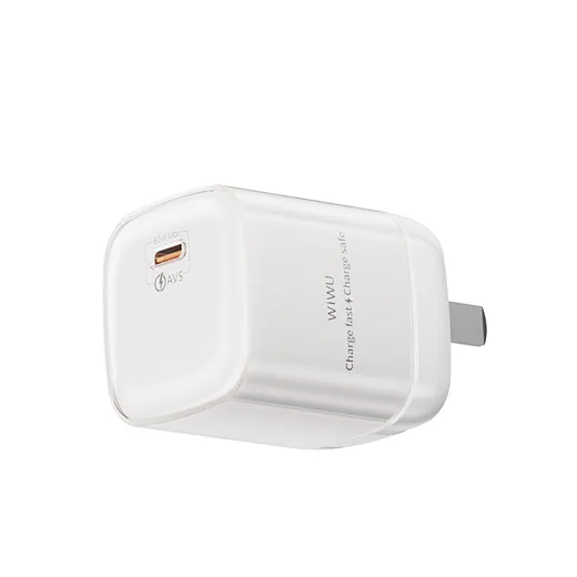 Experience the new benchmark in speed and portability with the WiWU Jade 60W GaN Charger. Engineered specifically for the Apple ecosystem, it features the advanced AVS dynamic protocol, delivering a lightning-fast charge that powers your iPhone to 50% in just 20 minutes. At its core is a high-performance Gallium Nitride (GaN) chip that enables a smaller, lighter, and more efficient design without compromising on power or safety. Its beautifully compact, jelly-like aesthetic is complemented by foldable pins (CN version), making it the perfect, space-saving travel companion. With multiple safety protections and full protocol compatibility, it’s the only charger you need for your Apple devices.