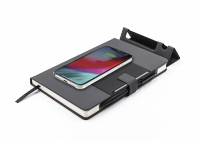 KAMEZ is a 15W wireless charging A5 notebook organizer with in-built folding mini-workstation – truly an avant-garde modern office notebook. Includes an integrated business card holder, magnetic clasp with integrated pen loop. Contains 192 pages and a folding phone and pen stand. Opens flat due to excellent binding quality