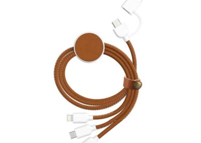 Koper is a RCS-certified recycled 6-in-1 charging cable that is made of 51% recycled PU and recycled TPE. Cable extends up to 120CM in length. It has a USB-A and Type-C input and 2-in-1 (micro-USB and lightning), Type-C, and micro-USB output. Packed in a recycled kraft gift box.