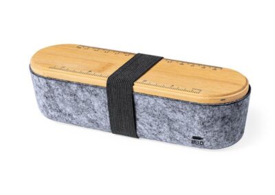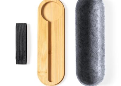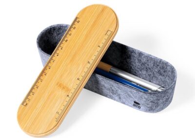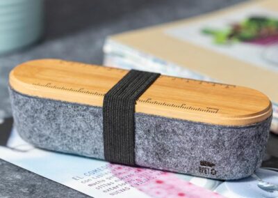 Labin is a multi-functional stationery / pencil case made of bamboo lid and Recycled RPET Felt Material. The lid can also be used as a ruler (cm and inch) or as a phone stand when inverted. Comes with an elastic fastener. Packed in an eco kraft box.