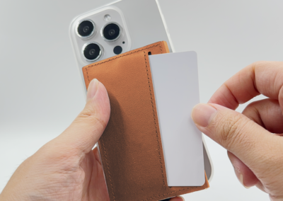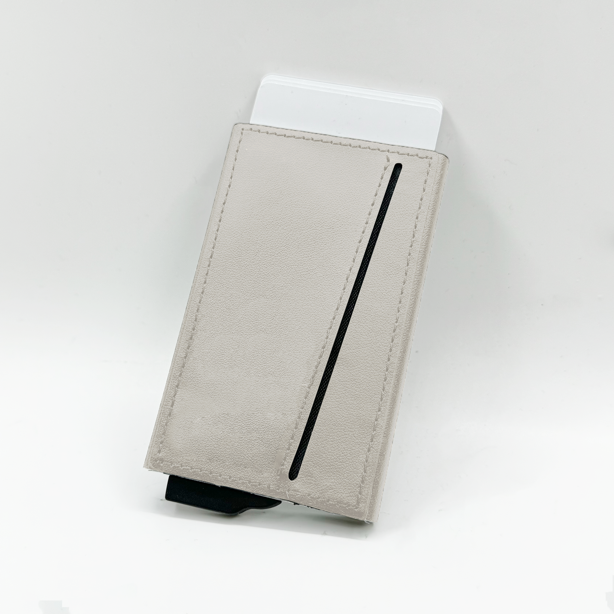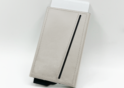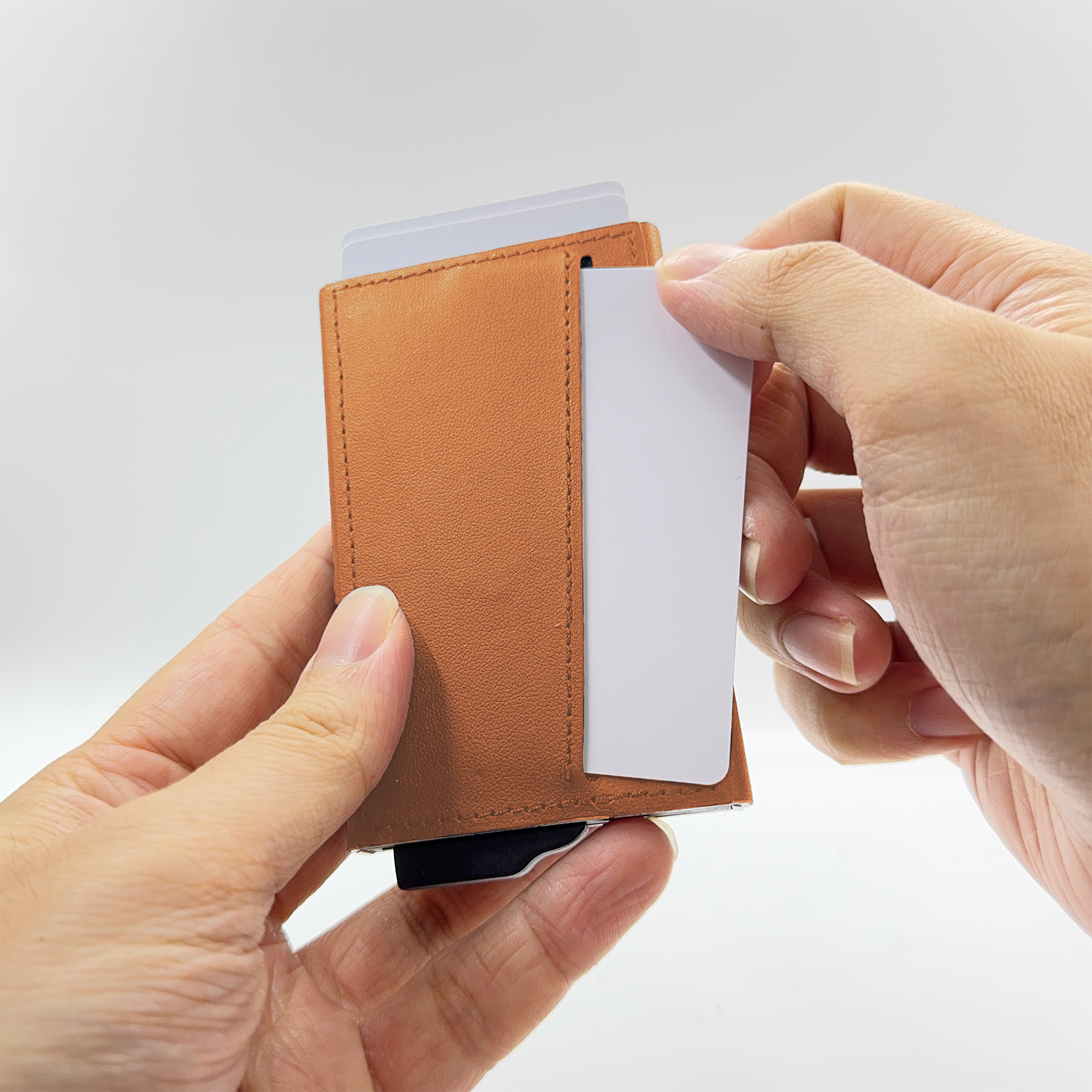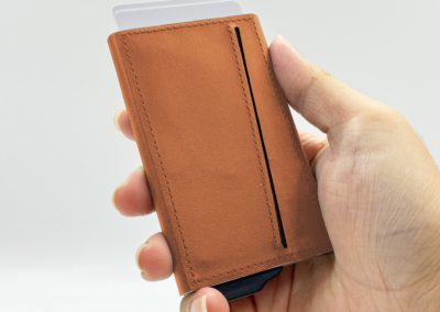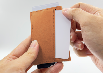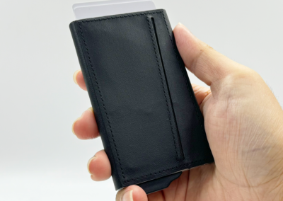 Strong magnetic recycled PU-RCS aluminium card holder that can hold up to 7 cards. Pop-up wallet with RFID and NFC blocking technology. Product Size: 10.6×6.3×1.1CM. Packaging: Kraft Paper Box