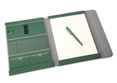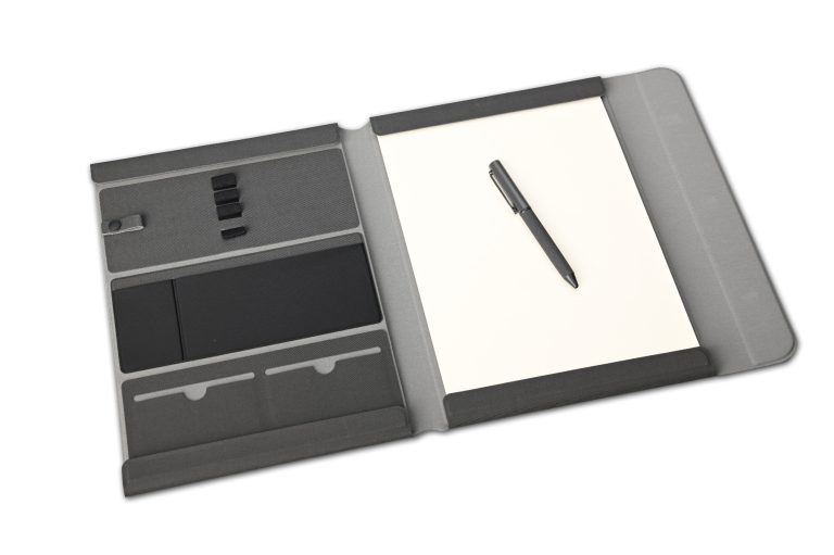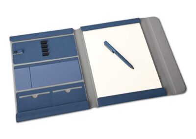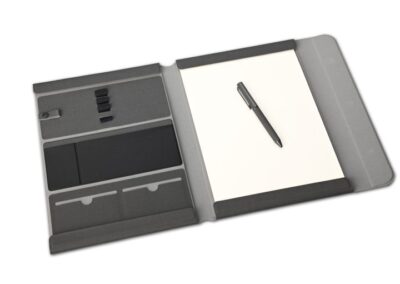 A4 Modular Portfolio made from a special PU material with detachable organizer, 20 sheets notepad and magnetic flap closure. Has 2 Lycra pockets , 2 card pockets and can hold 4 pens. Product Size: 24x30x2.5cm Packaging: Black paper box