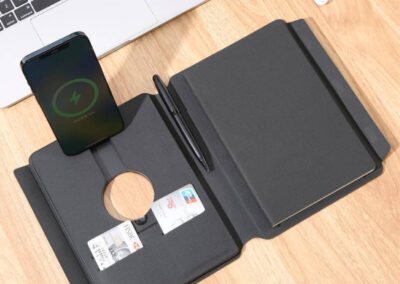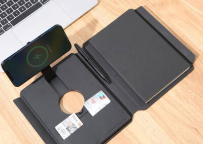 Santhome® MagSafe Smart A5 Organizer combines design elegance with latest magnetic technology. Includes a 10,000mAh powerful powerbank with a Smart 15W Mag-Wireless Charger for phone or watch, 32GB in-built USB flash drive, 64 sheet removable notebook and various card pockets, Onex is a masterpiece of sustainable and modern office technology – just snap an iPhone 12 or higher model for smart wireless charging. Onex is a CHANGE ZERO product, which means that it is developed with a net zero carbon footprint – By using RCS-certified recycled PU materials, we reduce 3% carbon emissions from material use (verified by ecoact®). Further, we offset the balance 3.87 kgCO2eq per unit by financing renewal energy projects through Climate Partner, making it a carbon-zero product. Packed in an elegant gift box.