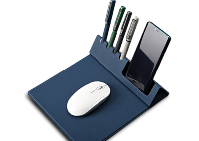 Mouse pad made from a Special PU material. Comes with desktop organizer that can hold 4 pens, a space for business cards which can be used as phone stand. Product Size: 23.5x 22cx 0.3cm (folded) Packaging: Black Paper Envelope