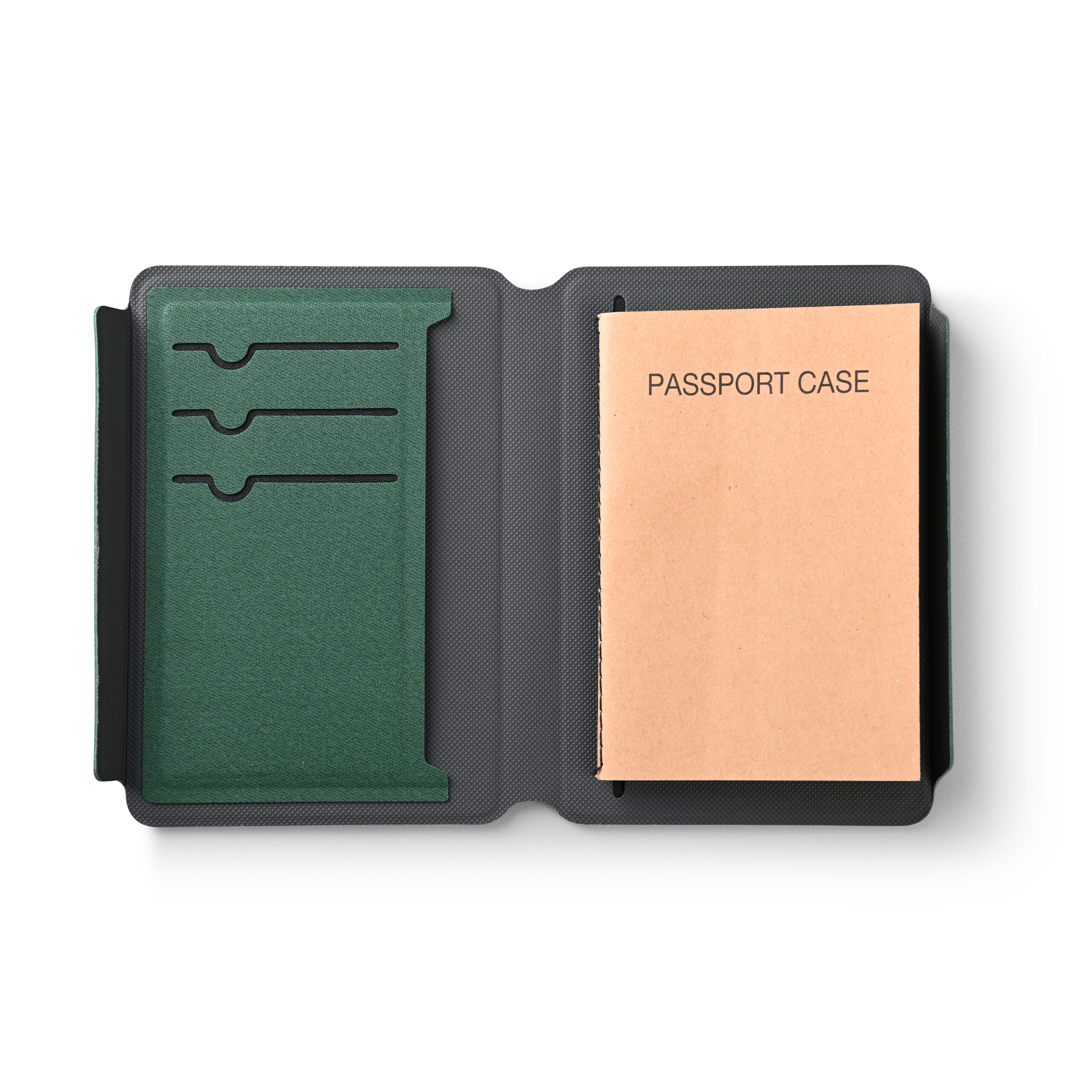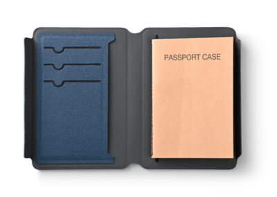 Passport Card Holder in welded recycled PU material. Simplet yet elegant design with magnetic flap closure. Product Size: 14.1×9.4×1.5cm. Packaging: Kraft Sleeve