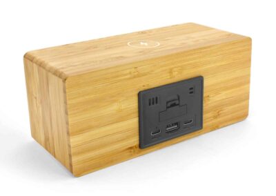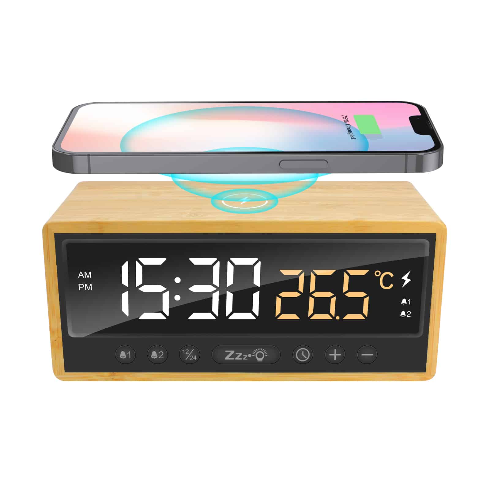 The PowerBase combines the simplicity of a wireless charger with the convenience of a clock into one comprehensive eco-friendly unit made of bamboo. The 15W wireless charger at the top provides your wireless-compatible devices with the fastest possible charge. The digital clock has a sharp LED display and also includes features such as dual alarm, date & time display, temperature and snooze mode.