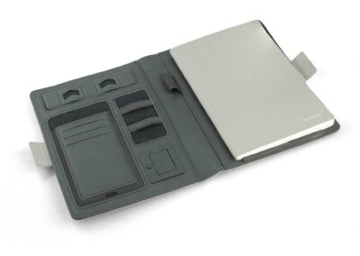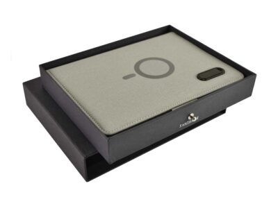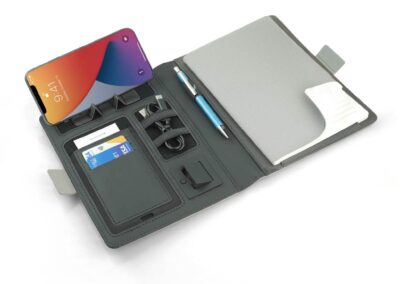 MagSafe Smart Notebook Portfolio combines design elegance and latest magnetic charging technology. With an impressive 8000 mAh powerbank, 10W MagSafe magnetic wireless charging, 32GB USB in-built flash drive, numerous ports, card pockets, phone/tablet pocket, pen loop, phone vertical/horizontal stand and an elegant refillable A5 notebook with ivory paper. Snap your phone (iPhone 12 or higher) to the wireless charger and the phone will align perfectly with the magnets inside. The 10W wireless charger is compatible with all QI devices (Iphone 8 and up and Android devices). Packed in an elegant sliding gift box.