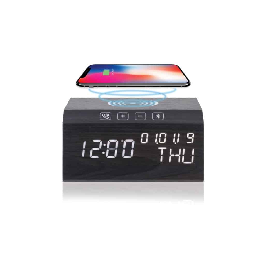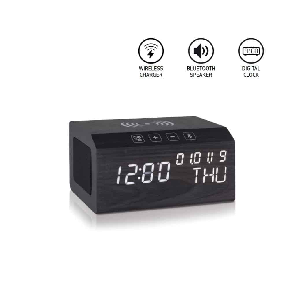 A combination of all the most useful daily electronic accessories into one comprehensive unit called the base station. The wireless charger at the top provides your wireless compatible devices with the fastest possible charge. The digital clock has a sharp white LED display. The Bluetooth speaker boasts incredibly clear sound and the touch-sensitive buttons allow you to control the volume, and song and answer calls with ease. Comes in a premium wooden finish.