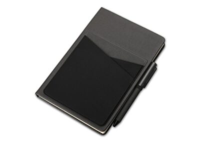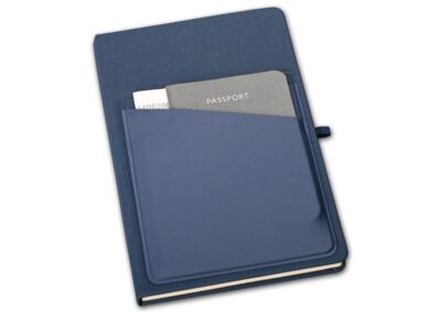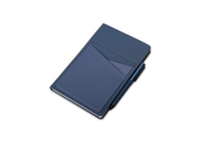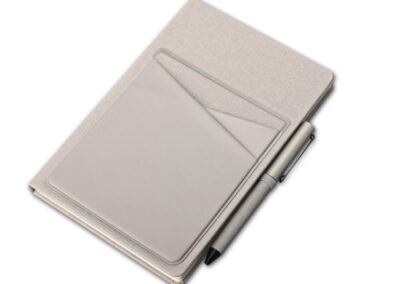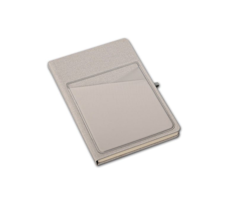 A5 linen 80 sheets notebook with lycra front pockets and pen holder in special PU material. Product size: 21.5×14.2×1.5cm. Packaging: Polybag