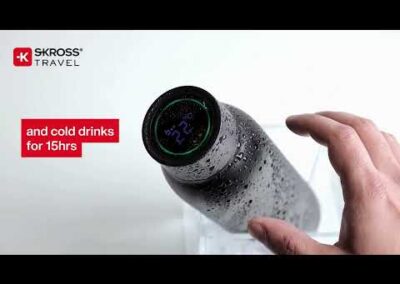 Drinking enough water each day, and knowing how much to drink is hard. Skross® PRO 21oz. Smart Water Bottle makes it easy one sip at a time. With our smart lid, you can set hydration reminders at regular intervals of your choice – 1 hrs / 1.5 hrs / 2 hrs using the LCD touchscreen in the lid. It also tells you the temperature of the beverage inside. The lid works for 30 days on a single charge, and comes with a magnetic charger for recharging once a month. The smart water bottle is vacuum-insulated stainless steel keeps drinks hot for up to 12 hours and cold for up to 24 hours. Capacity: 600ml. Designed by Skross – a leading Swiss design brand. Includes 1 year warranty.