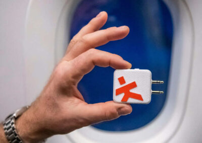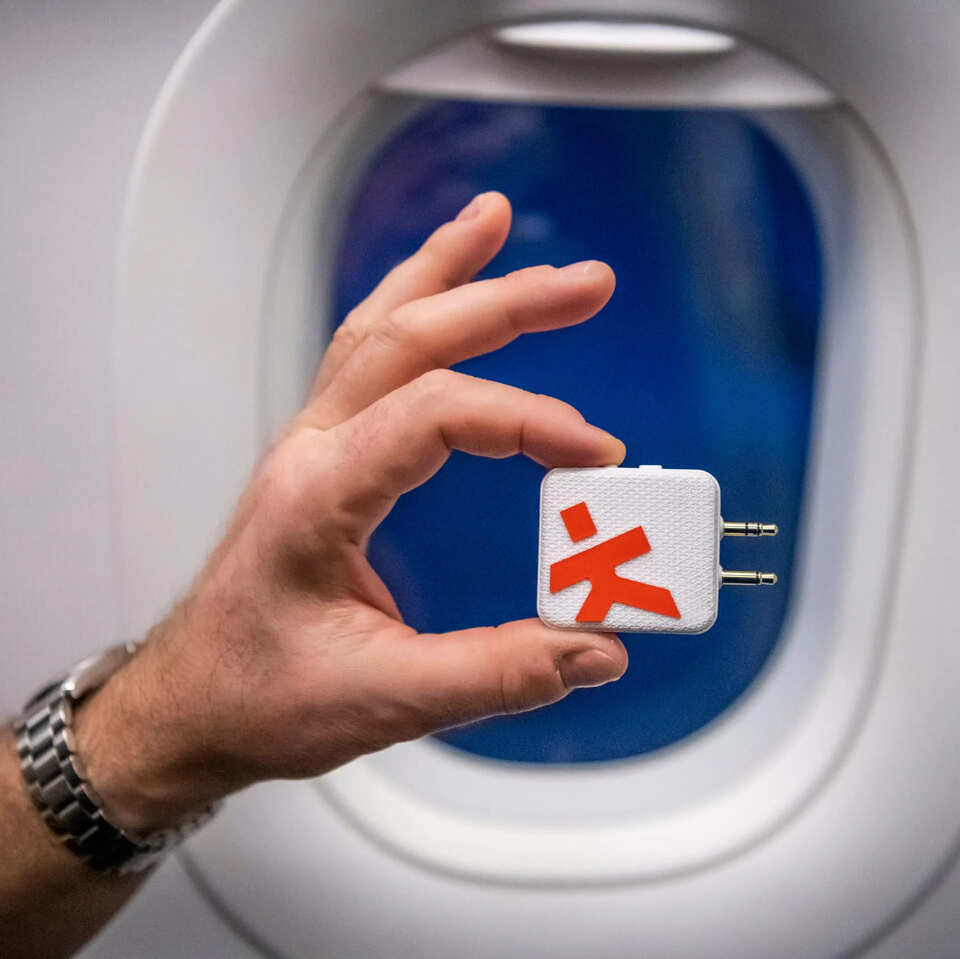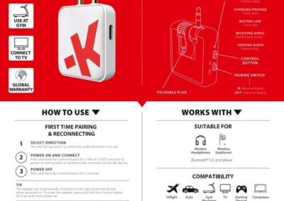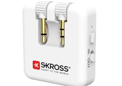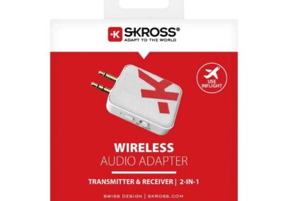 This Wireless Audio Adapter from SKROSS® conveniently connects your wireless headphones or earphones to inflight entertainment, TVs, computers, autos, portable gaming devices, gym machines and more. Provides up to 20 hours of battery life with USB-C charging. The foldable 3.5mm mini jack connectors ensure compatibility with single or dual prong input for ultimate flexibility and compatibility with various devices.