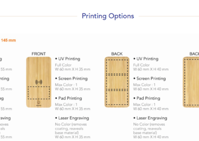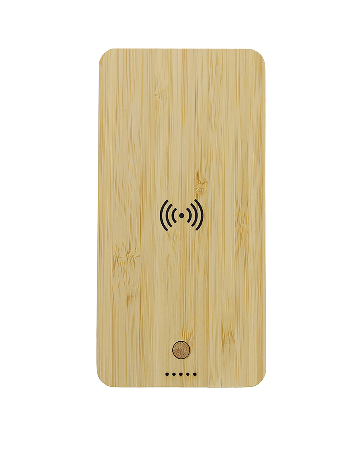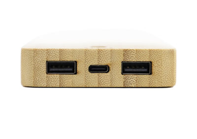 10000 mAh power bank with 5W wireless charger made from eco-friendly bamboo material with wireless charging properties. Comes with 2 USB outputs & type C input.