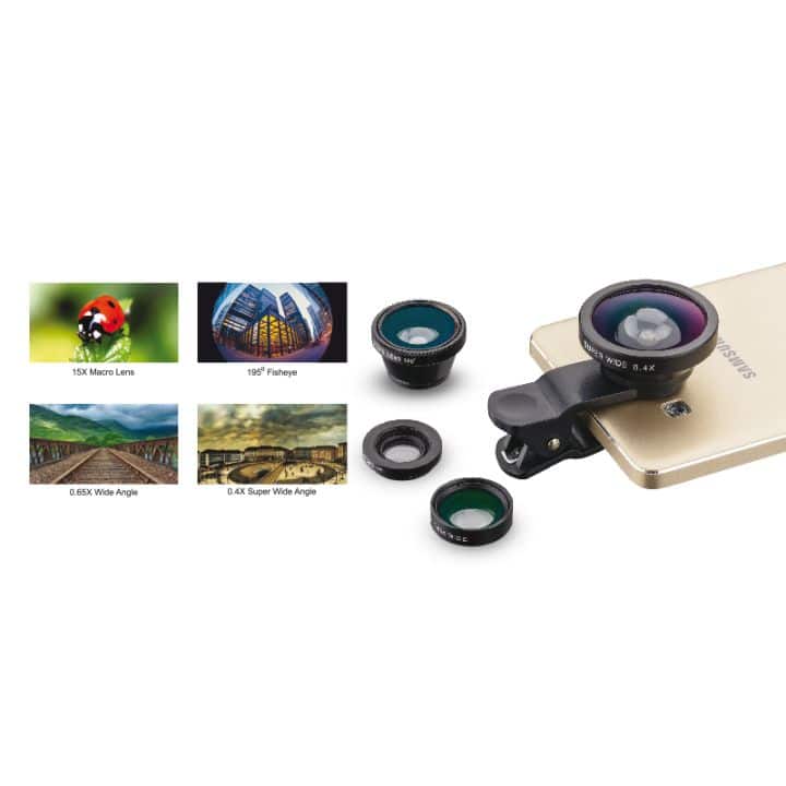 This lens set features 1 each of 15X Macro, 0.65X Wide Angle, 0.4X Super Wide Angle and 195 Degree Fish Eye Lenses. The sturdy frames attach onto the phone camera securely and the high quality optical glass lenses enable distortion free professional photography.