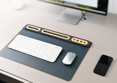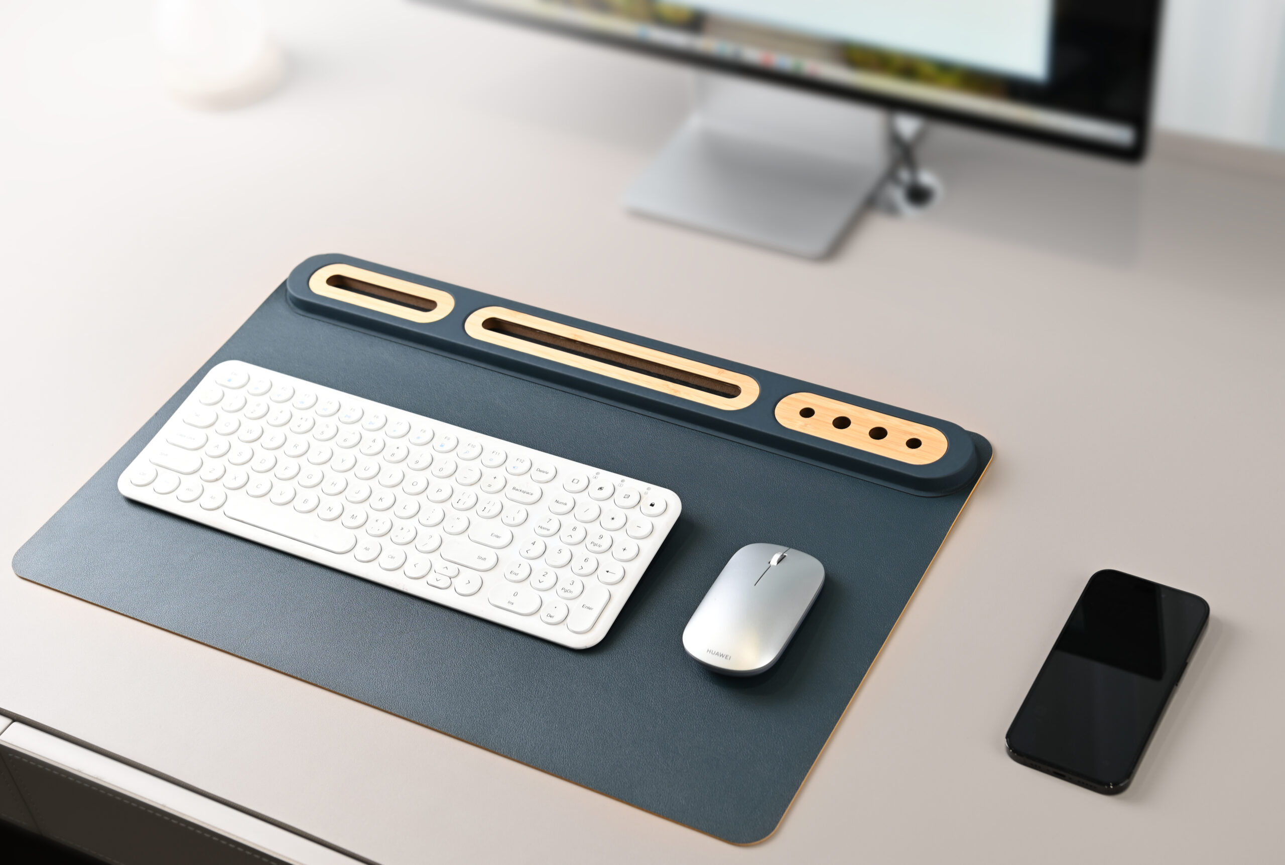 Desk mat organizer in a soft recycled PU Material with bamboo organizers: tablet/ipad holder, pen holder and business card holder.Product Size: 55x35x1.5cm. Packaging: Kraft Paper Box