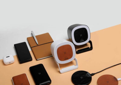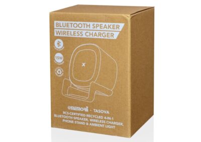 Tasova is a RCS-certified recycled 4-in-1 bluetooth speaker (5W), 15W wireless charger, phone stand, and ambient lamp light. It is made of 58.96% RCS recycled plastic and recycled leather. It comes with a Type C cable that extends up to 100CM. Packed in a recycled kraft gift box. A great gift for the office or home use.