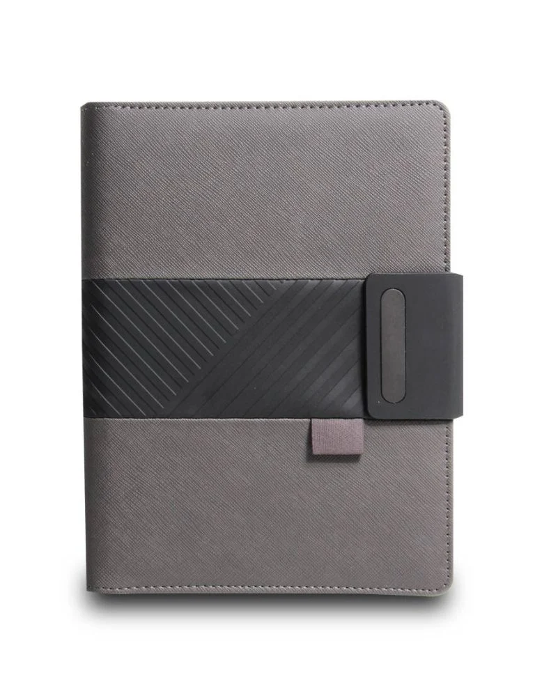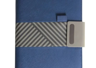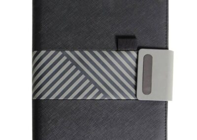 Improved Trendy Organizer with A5 notebook in PU Material. Has unique and signature design in the middle which can be a business card holder and elastic pen loop above it. Got a magnet closure with elongated metal plate for branding. Inside has mobile stand, elastic pen loop, business card holder, 2 elastics to hold accessories and cables. Has a notebook with 56 sheets of cream lined paper and 8 sheets of blank paper. Product Size: 22.5x17x3.5cm Packaging: Paper Box