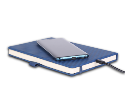 A5 notebook with 5W Wireless Charger in debossed pattern design. Has 88 sheets of cream lined paper and 8 sheets of blank paper. Charging port in upper side of notebook. Comes with Pen loop and elastic closure. Product Size: 21.5x14x1.7cm Packaging: Non Woven Sleeve in a Cream Paper Box