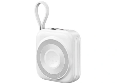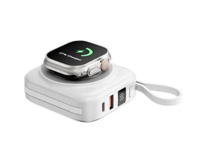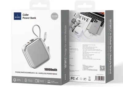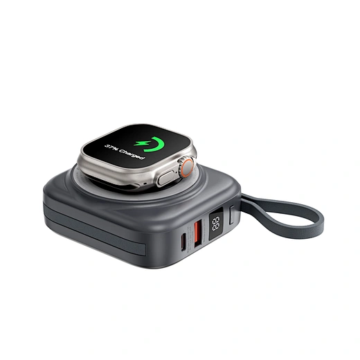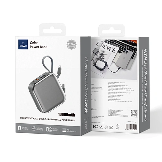 Simplify your power needs with the WiWU Cube 5-in-1 Power Bank. This is the ultimate, all-in-one portable charging hub, designed to power your entire collection of devices. The main surface features a 15W magnetic wireless charger for your smartphone and a dedicated 2.5W module for your Apple Watch. Tucked neatly into the sides are two built-in fast-charging cables—one USB-C and one Lightning—ready for your tablet or other gadgets. Need another port? The extra USB-A port supports up to 22.5W of super-fast charging. The clear digital display keeps you informed of the remaining 10000mAh of power, while the compact, cube-like design with an integrated lanyard makes it incredibly easy to carry. It’s the only power bank you need to keep everything charged, everywhere you go.