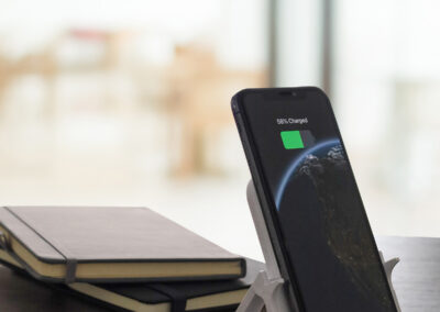 Wireless charger made from abs plastic + bamboo material featuring a foldable stand. It features a type-C input & comes with a 1m type-C charging cable.